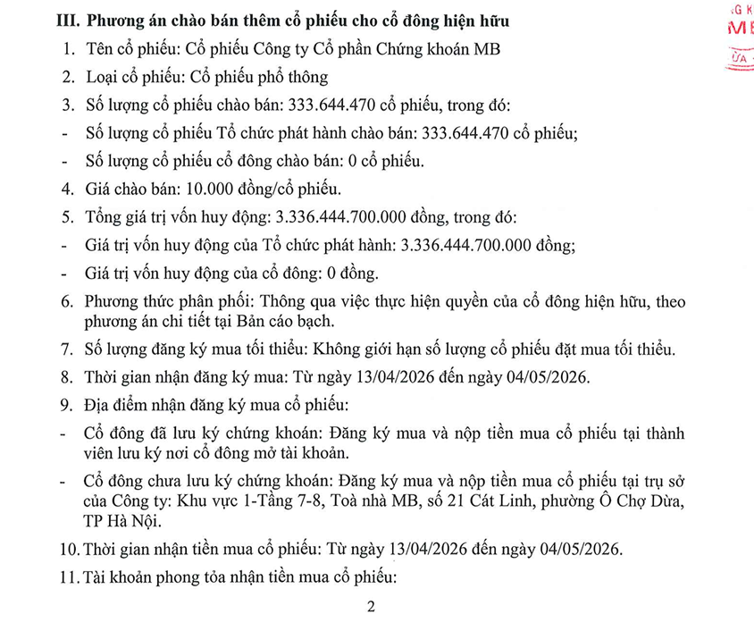 Theo thông báo, MBS được cấp giấy chứng nhận đăng ký chào bán cổ phiếu ra công chúng vào ngày 19/03/2026. MBS dự kiến phát hành hơn 333 triệu cổ phiếu phổ thông với giá chào bán 10.000 đồng/cổ phiếu, tương ứng tổng giá trị vốn huy động đạt hơn 3.336 tỷ đồng .
