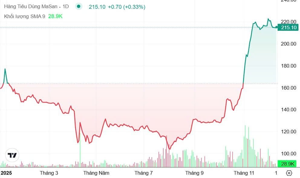 Tại phiên 11/12, cổ phiếu cán mốc 215.000 đồng, đưa vốn hóa vượt 227.000 tỷ đồng, cao hơn đáng kể so với công ty mẹ Masan Group (MSN) và thậm chí vượt quy mô vốn hóa của Vinamilk (VNM), một trong những doanh nghiệp dẫn đầu ngành tiêu dùng – thực phẩm trong nhiều năm.