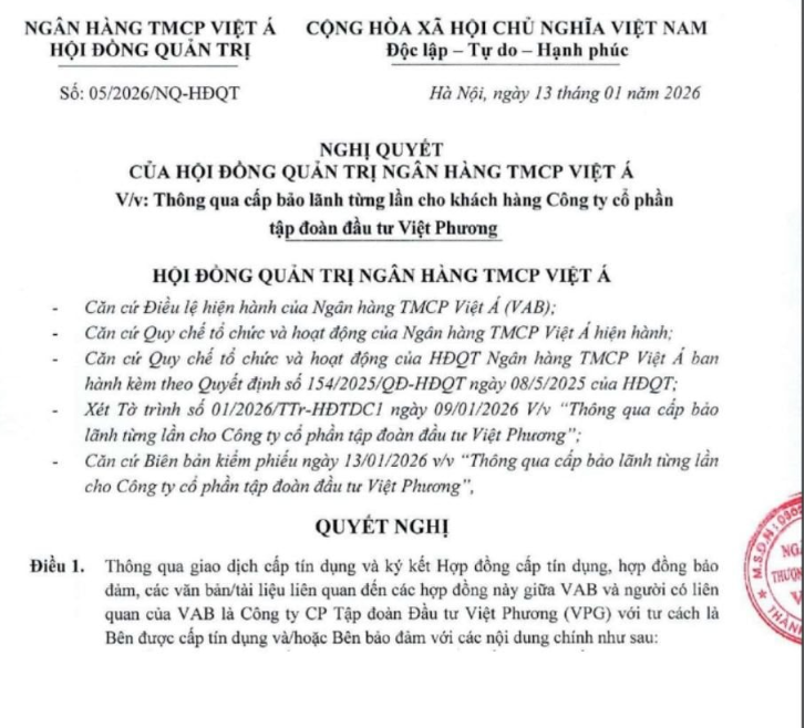 Theo nội dung quyết nghị, VietABank chấp thuận thực hiện giao dịch cấp tín dụng, đồng thời ký kết các hợp đồng cấp tín dụng, hợp đồng bảo đảm và các văn bản liên quan với Việt Phương Group – doanh nghiệp vừa là cổ đông lớn, vừa là bên có liên quan của ngân hàng. Trong giao dịch này, Việt Phương Group đồng thời là bên được cấp tín dụng và bên bảo đảm.