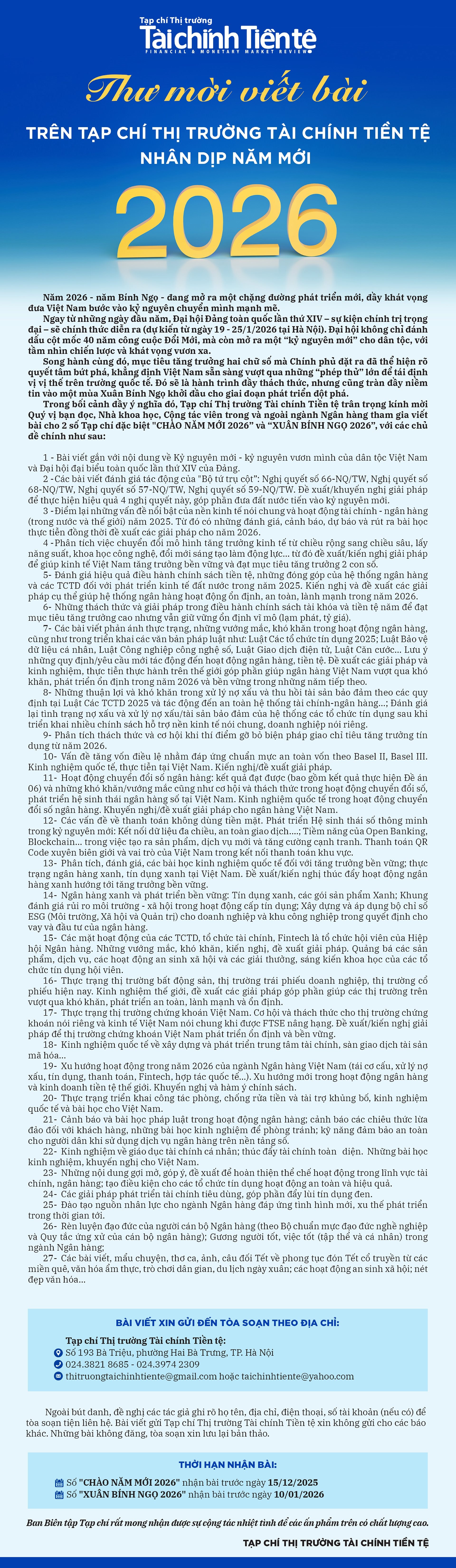 (Banker.vn) Tạp chí Thị trường Tài chính Tiền tệ dự định xuất bản 2 số Tạp chí đặc biệt: “CHÀO NĂM MỚI 2026” và “XUÂN BÍNH NGỌ 2026”. Ban biên tập Tạp chí Thị trường Tài chính Tiền tệ trân trọng kính mời Quý bạn đọc, Nhà khoa học, Cộng tác viên trong và ngoài ngành Ngân hàng tham gia viết bài.