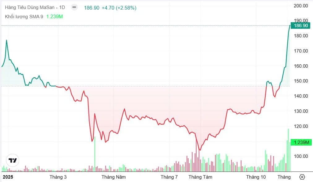 Với đà tăng mạnh mẽ, vốn hóa của MCH hiện đã áp sát mốc 200.000 tỷ đồng, vượt qua cả tập đoàn mẹ Masan Group (hơn 120.000 tỷ đồng), đồng thời chỉ đứng sau bảy “ông lớn” niêm yết trên HoSE gồm VIC, VCB, VHM, CTG, BID, TCB, VPB, và ngang ngửa các doanh nghiệp quy mô lớn khác như MBB, HPG.