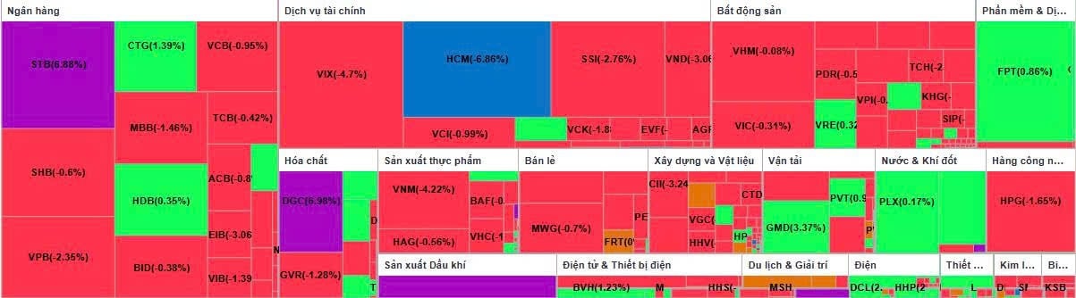 Ở nhóm ngân hàng, diễn biến phân hóa khá rõ. STB tiếp tục là điểm sáng lớn nhất khi giữ vững mức giá trần 62.100 đồng/cổ phiếu với thanh khoản gần 26 triệu đơn vị và lượng dư mua trần còn lớn, đóng góp 1,61 điểm vào VN-Index, chỉ sau GAS 2,83 điểm.