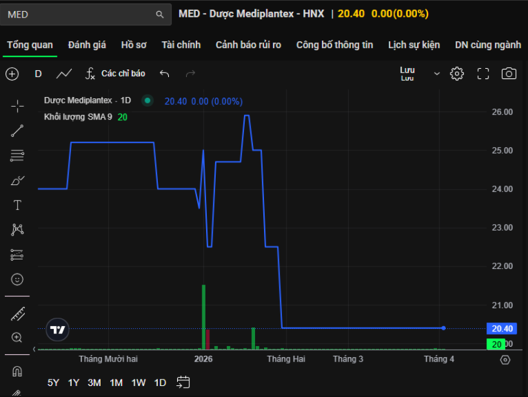 Cổ phiếu MED chính thức giao dịch trên HNX từ ngày 18/03/2020 với hơn 12,41 triệu cổ phiếu niêm yết và vốn hóa khoảng 253 tỷ đồng. Trong giai đoạn từ cuối tháng 3 đến đầu tháng 4/2026, mã này gần như đi ngang khi duy trì mức giá 20.400 đồng/cổ phiếu trong nhiều phiên liên tiếp, không ghi nhận biến động về giá.