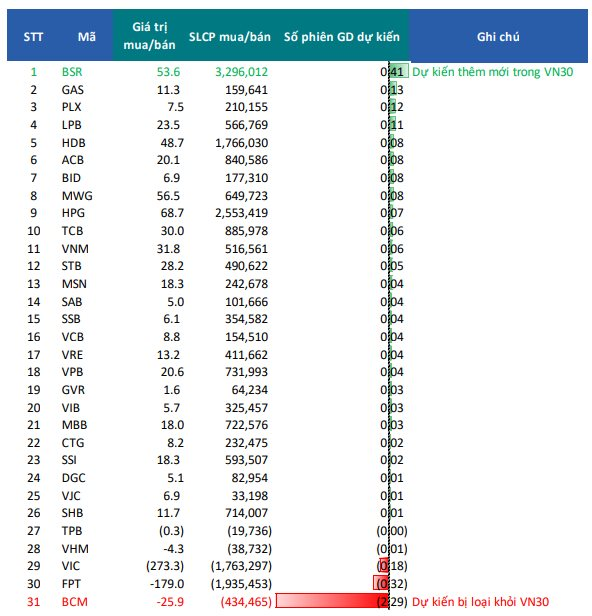 Nếu kịch bản này xảy ra, BSC ước tính các quỹ ETF mô phỏng chỉ số VN30 sẽ mua vào khoảng 3,3 triệu cổ phiếu BSR để tái cơ cấu danh mục. Ở chiều ngược lại, cổ phiếu BCM có thể bị các quỹ này bán ra khoảng 400.000 đơn vị.