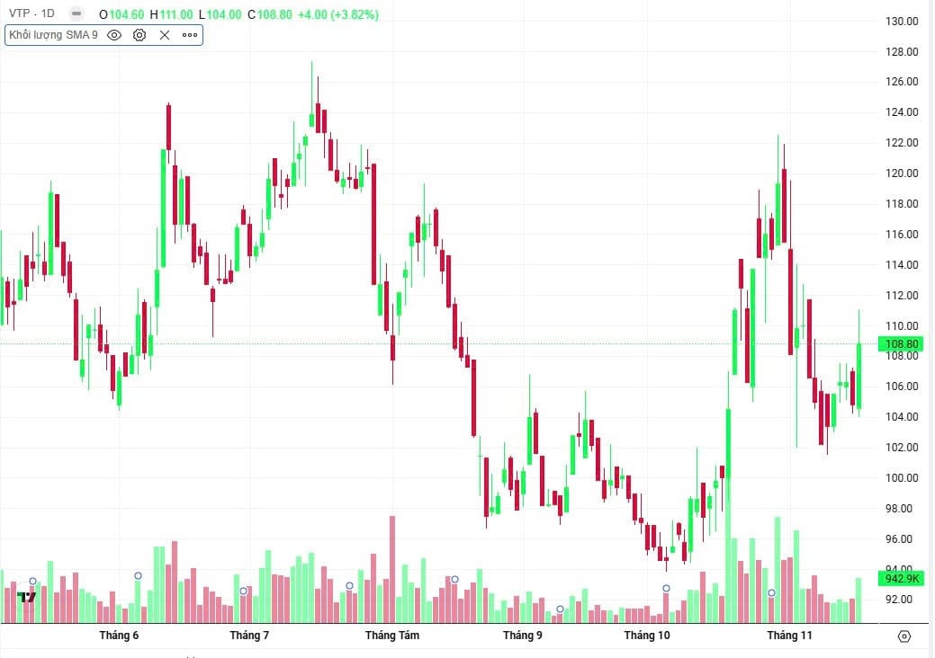 Cụ thể, cổ phiếu của tổng Công ty CP Bưu chính Viettel (HOSE: VTP) bứt phá với một cây nến xanh lá lớn, tăng gần 4000 đồng/cổ phiếu (tương đương mức tăng gần 4%). Thị giá đóng cửa ở mức 108.800 đồng. Xét trong ngắn hạn, các cổ đông của VTP nếu bắt đầu nắm giữ từ hồi đầu tháng 10 với vùng giá thấp khoảng 93.000 đồng, hiện tại đang có khoản lợi nhuận khoảng 17%.