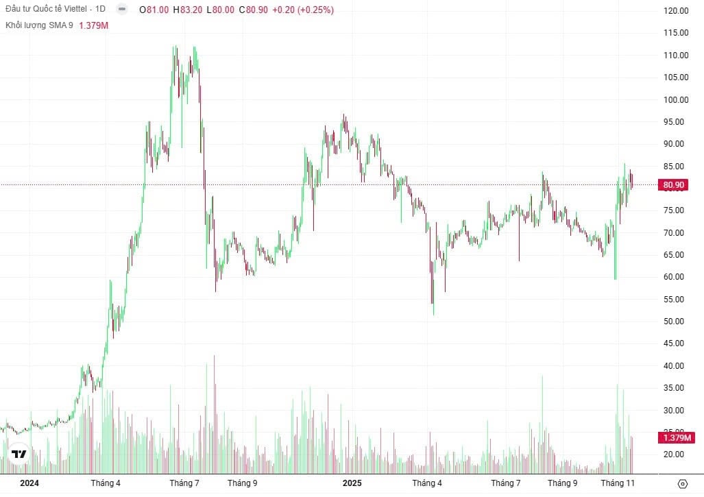 Không tăng mạnh như hai cổ phiếu nói trên, cổ phiếu Tổng Công ty CP Đầu tư quốc tế Viettel (Upcom: VGI) kết phiên ở mức giá 80.900 đồng, chỉ nhích khiêm tốn 0,25%.