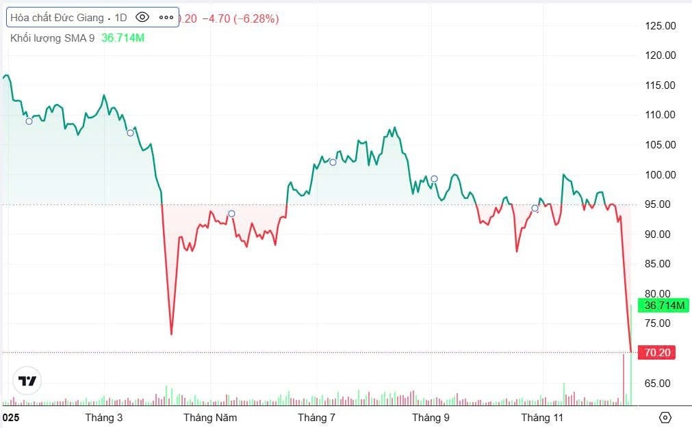 Kết phiên 19/12, DGC lùi về quanh 70.200 đồng/cổ phiếu. Đáng chú ý, đây không phải là một nhịp điều chỉnh thông thường mà là chuỗi giảm mạnh với 4 phiên liên tiếp lao dốc, trong đó có tới 3 phiên đóng cửa trong sắc xanh lơ. Thanh khoản bùng nổ, có phiên ghi nhận gần 10% vốn điều lệ được sang tay – mức hiếm thấy với một cổ phiếu từng được xem là “phòng thủ”.