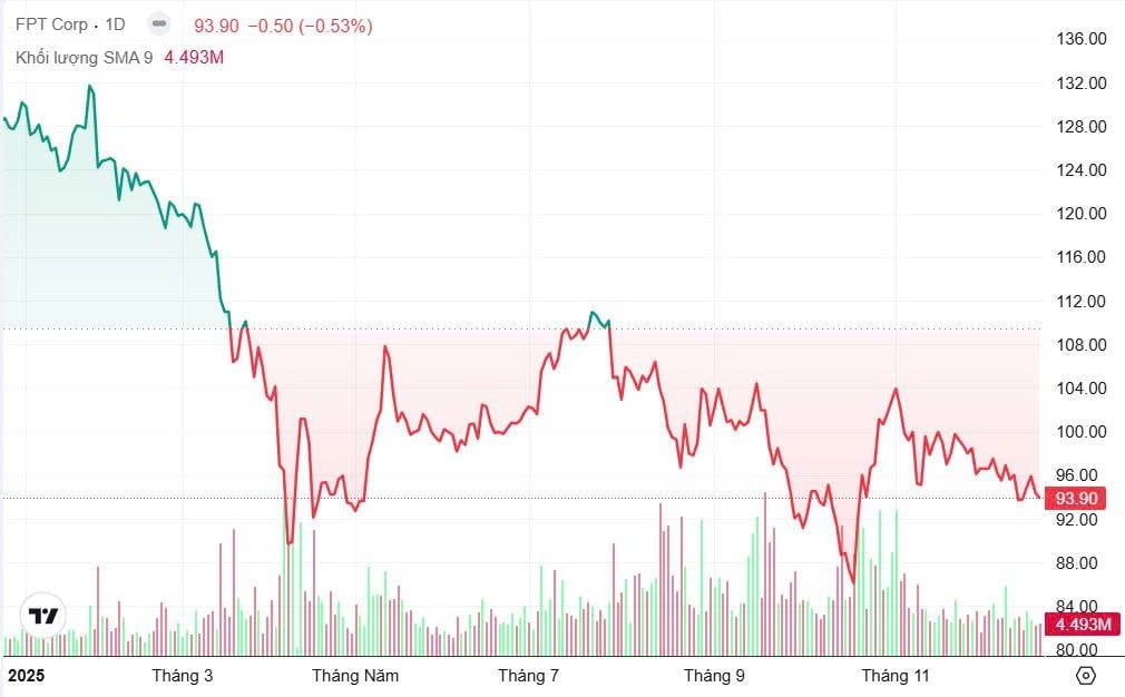 Chốt phiên 19/12, FPT giao dịch quanh mức 93.900 đồng/cổ phiếu, tương đương vùng đáy ghi nhận trong giai đoạn biến động mạnh hồi tháng 4. So với vùng đỉnh đầu năm, mức giảm của FPT lên tới gần 28%.
