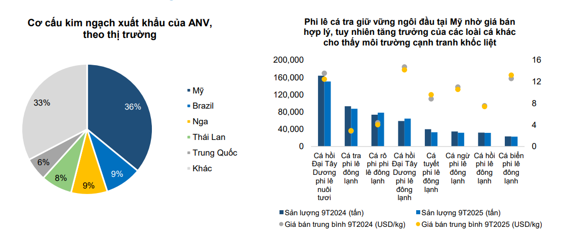 Theo ước tính của Chứng khoán Bảo Việt, trong tháng 11/2025, ANV chiếm khoảng 7% tổng kim ngạch cá tra Việt Nam xuất khẩu sang Mỹ, tăng khoảng 4 điểm phần trăm so với năm trước. Song song với đó, cá rô phi tiếp tục đóng vai trò bổ trợ, giúp doanh nghiệp giảm bớt sự phụ thuộc vào một sản phẩm đơn lẻ, đây vốn là điểm yếu cố hữu của nhiều doanh nghiệp thủy sản trong các chu kỳ trước.