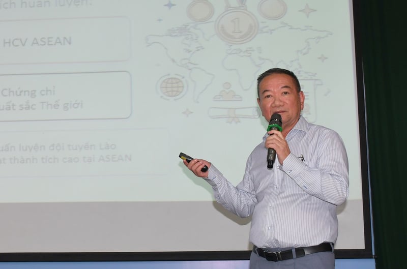Thầy Hoàng Quốc Long, Hiệu trưởng Trường Trung cấp Nguyên Tất Thành, trình bày tham luận "Chia sẻ kinh nghiệm thực tế trong huấn luyện và tham gia thi đấu tại các kỳ thi WorldSkills" tại sự kiện. Ảnh: Thanh Minh.