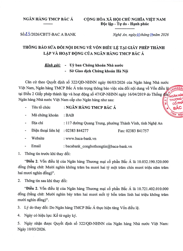 Việc phát hành cổ phiếu giúp BAB bổ sung thêm nguồn vốn chủ sở hữu, qua đó gia tăng quy mô vốn điều lệ. Sau khi hoàn tất đợt phát hành, vốn điều lệ của BAB tăng gần 689 tỷ đồng. Mức vốn điều lệ mới được ghi nhận trong giấy phép hoạt động của ngân hàng, đánh dấu bước tiến mới trong quá trình mở rộng quy mô hoạt động.