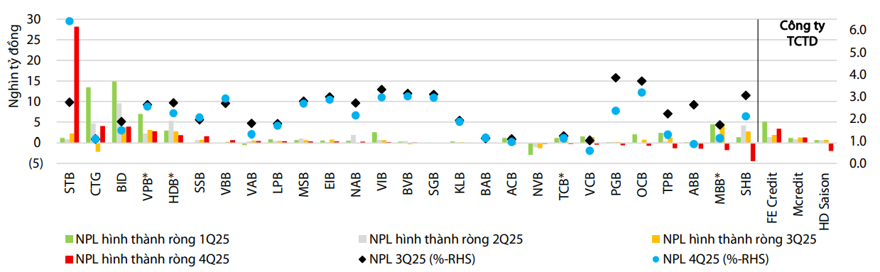 Một điểm nhấn khác là hoạt động thu hồi nợ xấu ngoại bảng, với quy mô hơn 23 nghìn tỷ đồng trong quý IV/2025, trở thành một trong những động lực lợi nhuận đáng chú ý trong giai đoạn cuối năm. Khoản thu này ghi nhận rõ tại các ngân hàng như BIDV, VPBank, Sacombank, LPBank và Nam A Bank, góp phần hỗ trợ kết quả kinh doanh trong bối cảnh chi phí vốn có xu hướng tăng.
