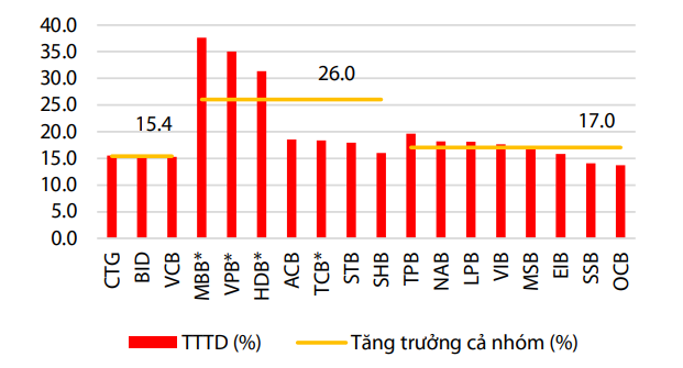 Trong bức tranh này, MBBank, VPBank và HDBank là những ngân hàng ghi nhận mức tăng trưởng tín dụng nổi bật nhờ tận dụng tốt hạn mức được giao, qua đó gia tăng hiện diện trên thị trường cho vay trong nửa cuối năm.