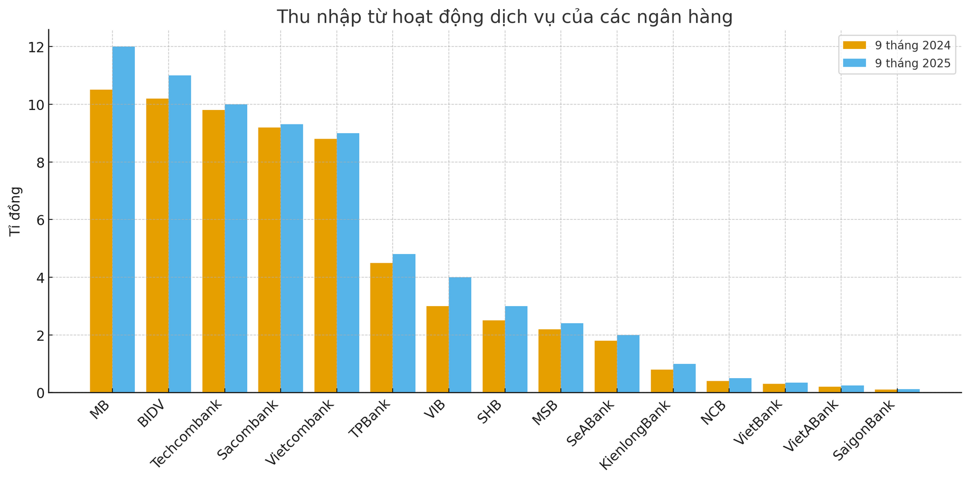 margin: 15px auto;" />Thu nhập từ dịch vụ bao gồm các khoản phí thanh toán, quản lý tài khoản, dịch vụ thẻ, phí bảo lãnh cùng nhiều tiện ích ngân hàng số. Đây là nguồn thu giúp các ngân hàng đa dạng hóa cơ cấu doanh thu và giảm rủi ro phát sinh từ hoạt động cho vay.