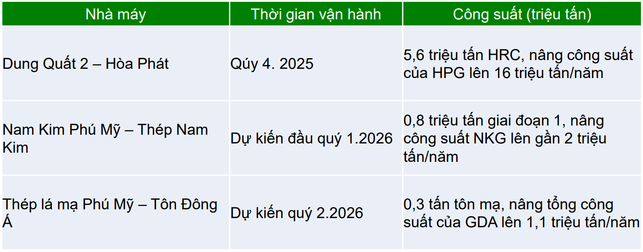 Song song với những động lực ngắn hạn, các doanh nghiệp lớn trong nước đang đồng loạt mở rộng công suất để đón đầu chu kỳ mới. Dự án Dung Quất 2 của Tập đoàn Hòa Phát dự kiến vận hành cuối năm nay sẽ nâng tổng công suất thép của doanh nghiệp lên khoảng 16 triệu tấn/năm, trong đó riêng HRC bổ sung thêm 5,6 triệu tấn. Tại phía Nam, các dự án tôn mạ và thép cán của Nam Kim và Tôn Đông Á cũng sẽ lần lượt đi vào hoạt động từ năm 2026, nâng đáng kể năng lực cung ứng của nhóm doanh nghiệp dẫn đầu. Việc mở rộng trong bối cảnh nhu cầu nội địa phục hồi và chính sách phòng vệ được thắt chặt được đánh giá sẽ giúp các doanh nghiệp gia tăng thị phần, đồng thời cải thiện vị thế cạnh tranh trên thị trường.