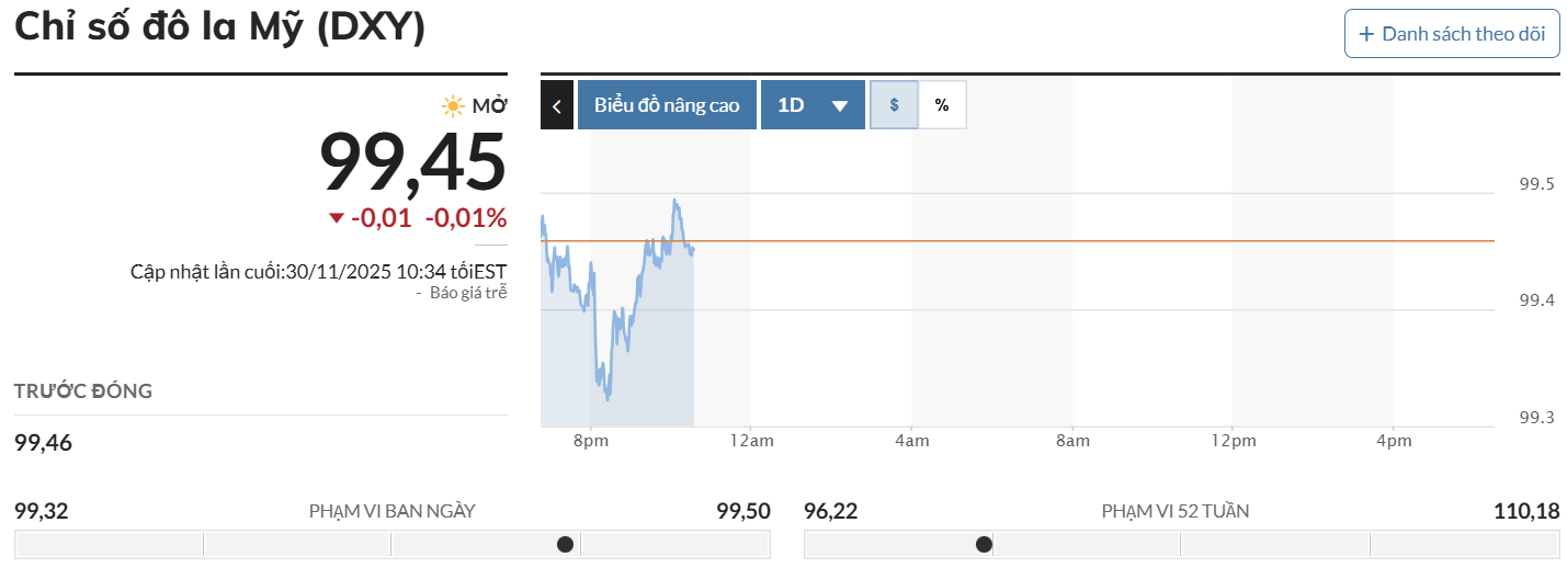 Cùng thời điểm, trên thị trường thế giới, chỉ số USD Index (DXY) - thước đo sức mạnh của đồng bạc xanh so với 6 đồng tiền chủ chốt - giảm 0,01%, ở mức 99,45 điểm so với phiên liền trước.