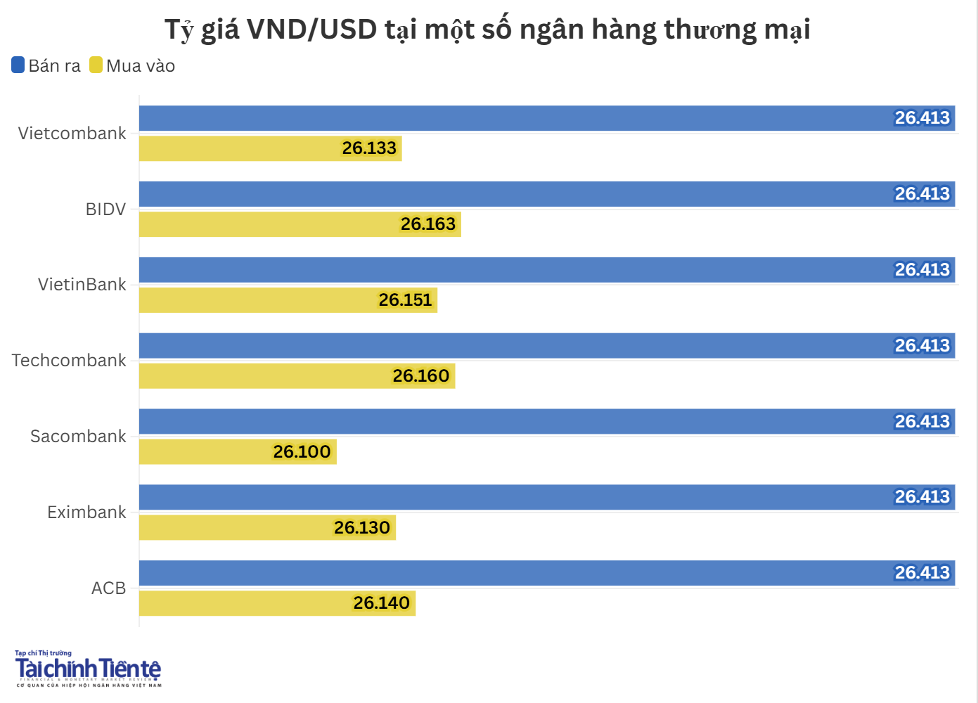 Hiện, giá mua thấp nhất ở mức 26.100 VND/USD, giá mua cao nhất ở mức 26.163 VND/USD. Giá bán ra được các ngân hàng đồng loạt niêm yết ở mức 26.413 VND/USD.