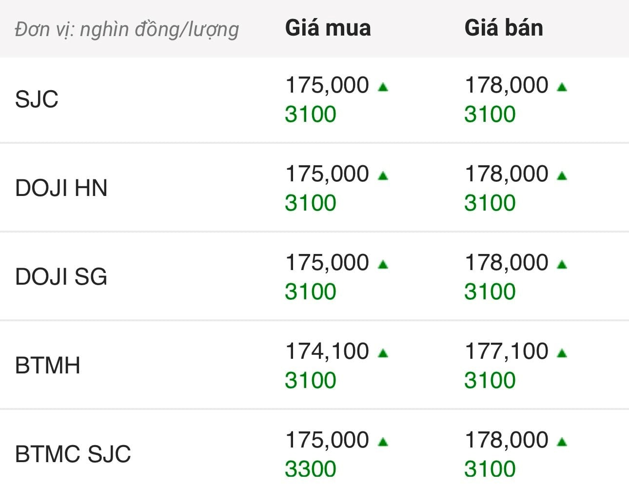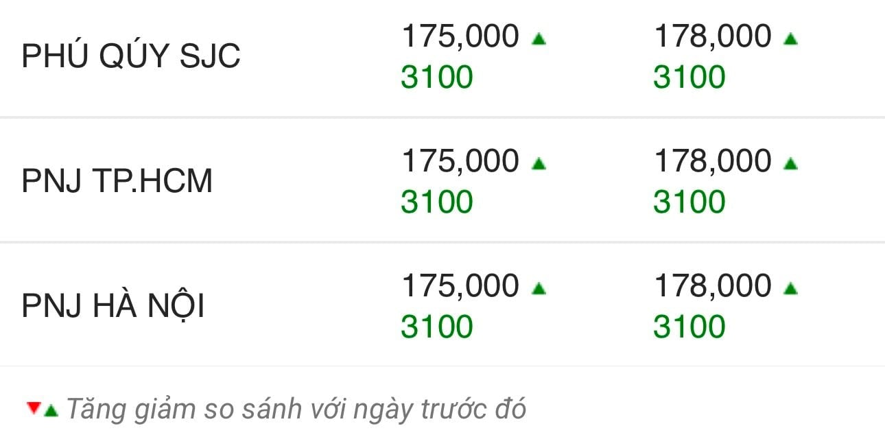 Công ty Vàng bạc đá quý Sài Gòn (SJC), DOJI, Bảo Tín Minh Châu, Bảo Tín Mạnh Hải, PNJ và Phú Quý SJC đồng loạt niêm yết giá vàng miếng SJC mua vào-bán ra ở mức 175-178 triệu đồng/lượng, tăng 3,1 - 3,3 triệu đồng ở cả chiều mua và chiều bán ra so với chốt phiên hôm qua (ngày 31/3).