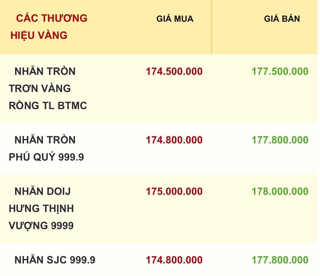 Cùng xu hướng, giá vàng nhẫn và vàng trang sức hôm nay cũng được các thương hiệu điều chỉnh tăng ở cả hai chiều mua vào và bán ra. Cụ thể, giá mua - bán vàng nhẫn tròn trơn được Bảo Tín Minh Châu niêm yết ở mức 174,5 - 177,5 triệu đồng/lượng; SJC và Phú Quý niêm yết vàng nhẫn ở mức 174,8 - 177,8 triệu đồng/lượng; riêng vàng nhẫn DOJI niêm yết ở mức 175 - 178 triệu đồng/lượng, tương đương vàng miếng.