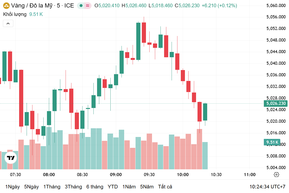 Thời điểm 9h30 theo giờ Việt Nam, giá vàng thế giới giao ngay ở mức 5.026 USD/ounce, tăng 1,17% trong 24 giờ qua, tương ứng với tăng 57,91 USD/ounce. Hiện, giá vàng thế giới quy đổi sang tiền Việt Nam đồng khoảng 158 triệu đồng/lượng.
