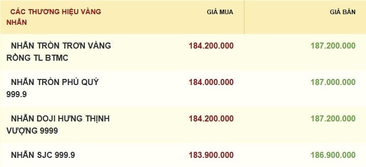 Cùng xu hướng, giá vàng nhẫn và vàng trang sức hôm nay cũng tăng ở cả hai chiều mua vào và bán ra so với chốt phiên trước. Trong đó, giá mua-bán vàng nhẫn tròn trơn vàng rồng Bảo Tín Minh Châu, vàng nhẫn tròn Phú Quý và vàng nhẫn DOJI Hưng Thịnh Vượng cùng niêm yết ở mức 184,2-187,2 triệu đồng/lượng. Riêng vàng nhẫn SJC niêm yết giá vàng nhẫn mua vào - bán ra thấp hơn, trong khoảng 183,9 - 186,9 triệu đồng/lượng.