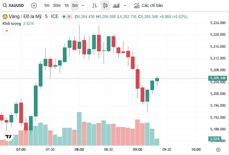 Thời điểm 9h20 theo giờ Việt Nam, giá vàng thế giới giao ngay ở mức 5.206 USD/ounce, tăng 2,17% trong 24 giờ qua, tương ứng với tăng 110,58 USD/ounce. Hiện, giá vàng thế giới quy đổi sang tiền Việt Nam đồng khoảng 165,1 triệu đồng/lượng.