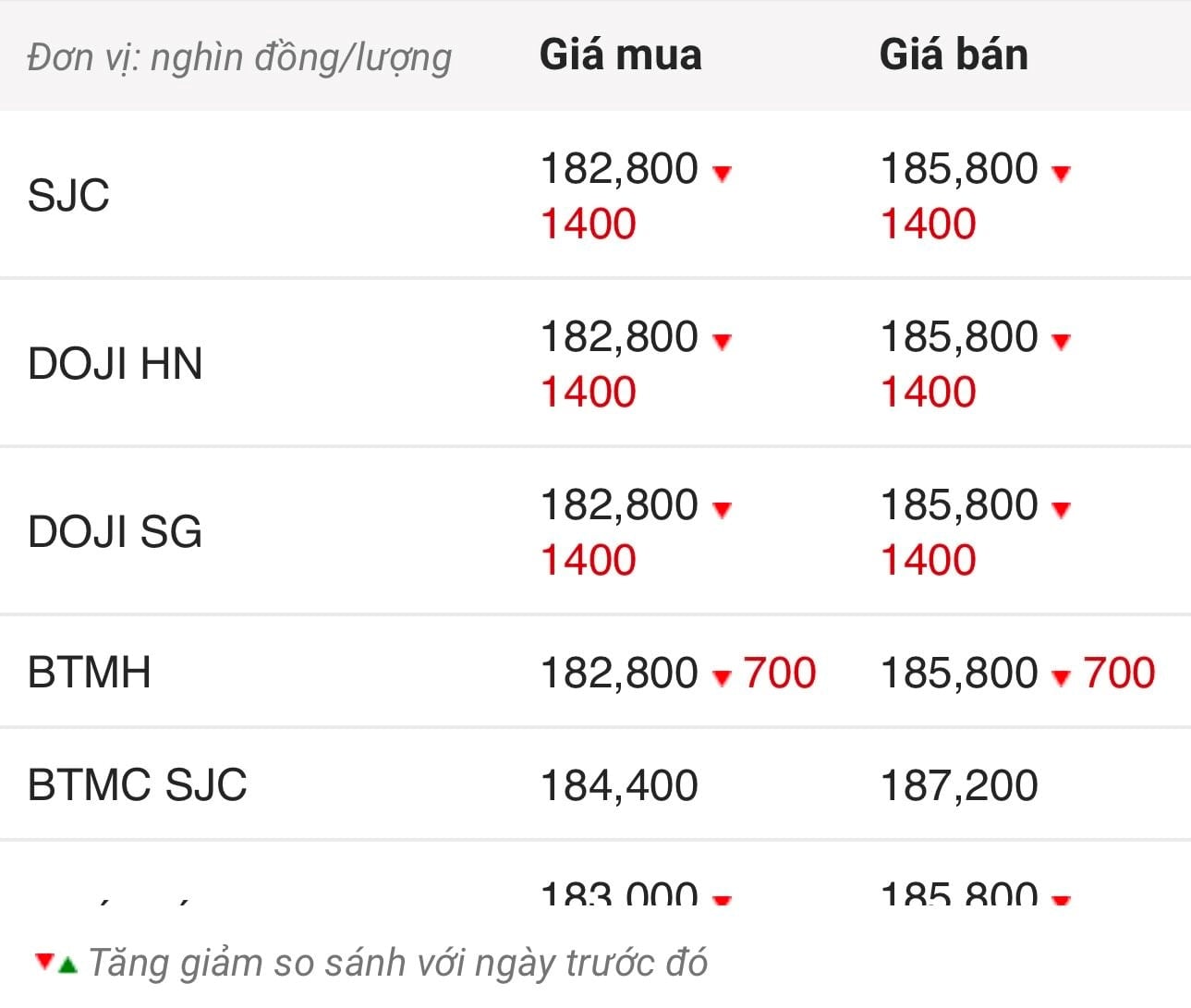 margin: 15px auto;" />Công ty Vàng bạc đá quý Sài Gòn (SJC), Tập đoàn Vàng bạc Đá quý DOJI cùng niêm yết giá vàng miếng SJC mua vào-bán ra ở mức 182,8-185,8 triệu đồng/lượng, giảm 1,4 triệu đồng ở cả chiều mua và chiều bán ra so với chốt phiên hôm qua.
