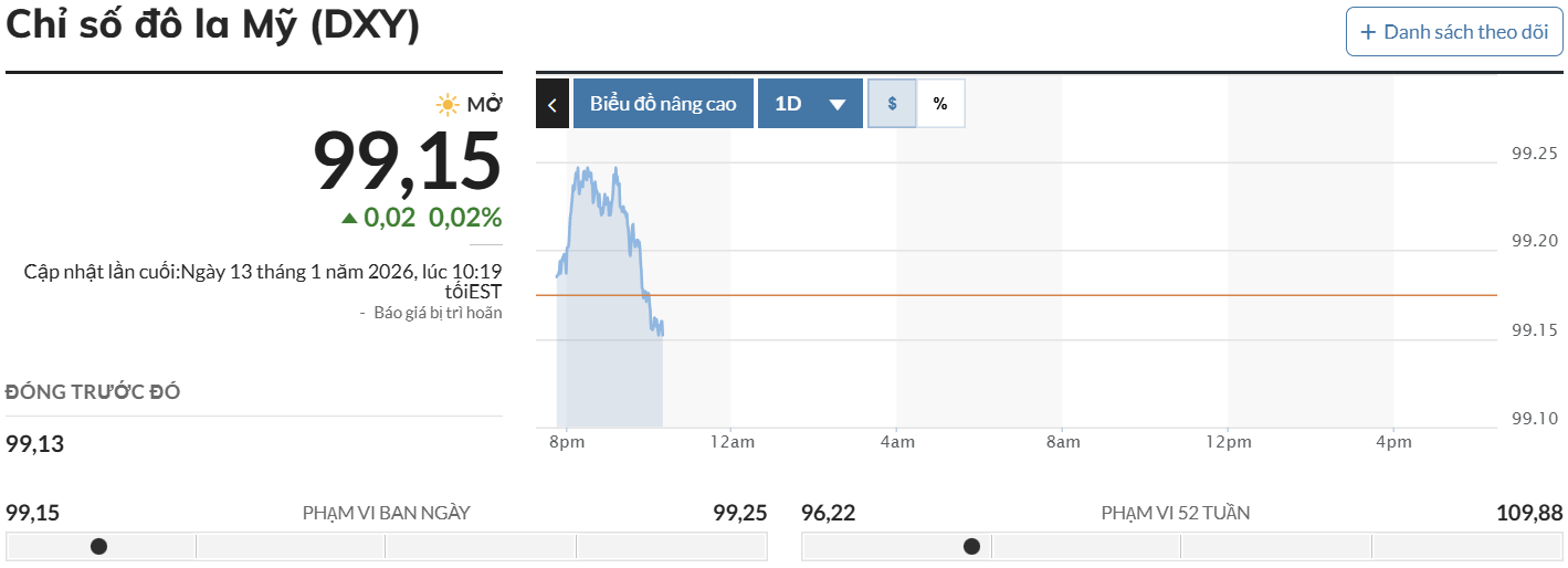 Cùng thời điểm, trên thị trường thế giới, chỉ số USD Index (DXY) - thước đo sức mạnh của đồng bạc xanh so với 6 đồng tiền chủ chốt - tăng 0,02%, hiện ở mức 99,15 điểm so với phiên trước.