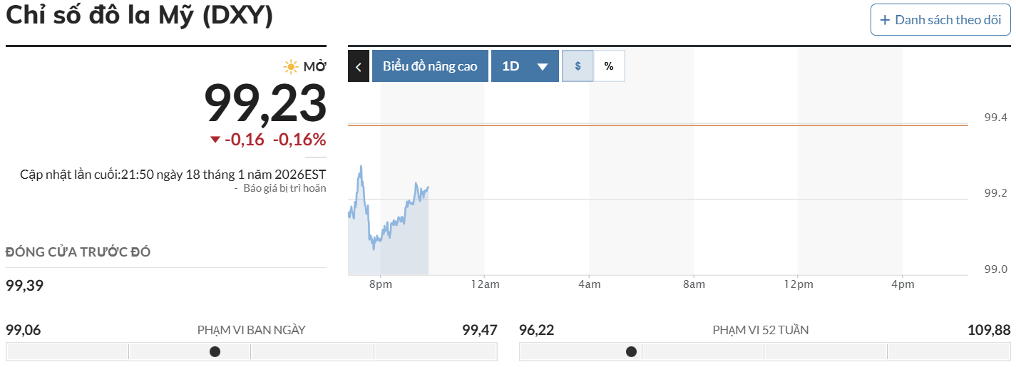 Cùng thời điểm, trên thị trường thế giới, chỉ số USD Index (DXY) - thước đo sức mạnh của đồng bạc xanh so với 6 đồng tiền chủ chốt - hiện ở mức 99,23 điểm, giảm 0,16 điểm so với sáng phiên ngày 16/1.