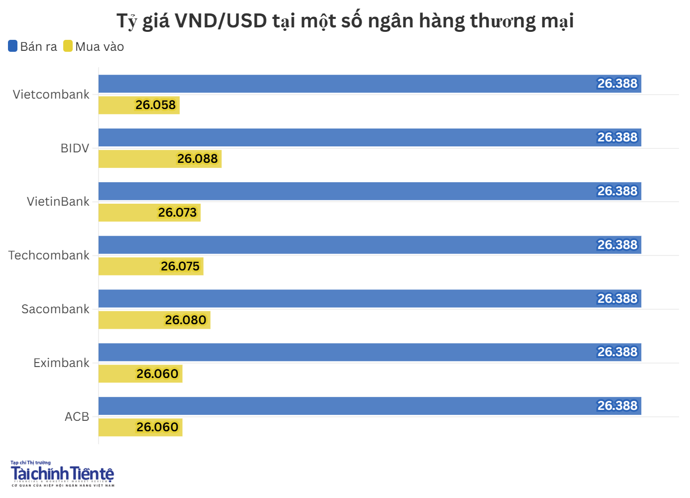 Hiện, giá mua thấp nhất ở mức 26.058 VND/USD, giá mua cao nhất ở mức 26.088 VND/USD. Giá bán ra được các ngân hàng đồng loạt niêm yết ở mức 26.388 VND/USD.