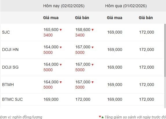 Tập đoàn Vàng bạc Đá quý DOJI, Bảo Tín Mạnh Hải và Bảo Tín Minh Châu cùng niêm yết giá vàng miếng miếng mua vào-bán ra ở mức 164 - 167 triệu đồng/lượng, cùng giảm 5 triệu đồng ở cả chiều mua và chiều bán so với chốt phiên cuối tuần trước; giảm 17,5 triệu đồng so với phiên ngày 30/1.