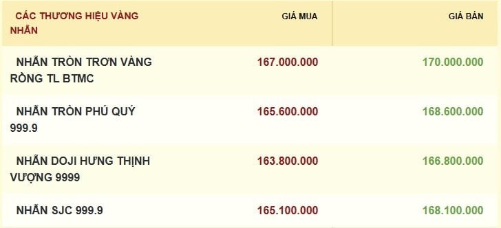 Cùng xu hướng giảm, giá vàng nhẫn và vàng trang sức cũng được các thương hiệu điều chỉnh giảm đến 13,5 triệu đồng ở cả 2 chiều mua và bán so với phiên cuối tuần ngày 30/1. Trong đó, giá mua-bán vàng nhẫn tròn trơn vàng rồng Bảo Tín Minh Châu ở mức cao nhất 167-170 triệu đồng/lượng. Các thương hiệu còn lại niêm yết giá vàng nhẫn mua vào trong khoảng 163,8 - 167 triệu đồng/lượng và giá bán ra trong khoảng 168,8-170 triệu đồng/lượng.