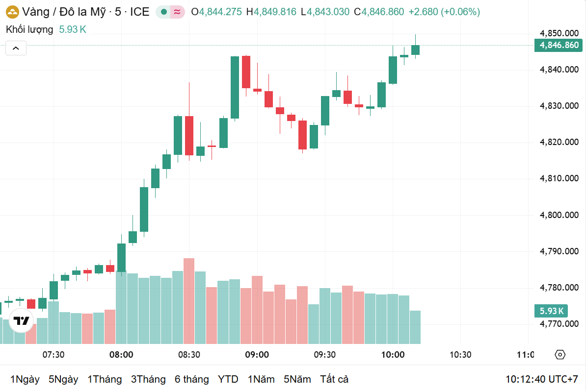 Giá vàng trong nước liên tục tăng mạnh, lập đỉnh mới trong những ngày qua và động lực chính thổi bùng "cơn sốt" giá vàng đến từ thị trường quốc tế. Thời điểm 10h50 theo giờ Việt Nam, giá vàng thế giới giao ngay ở mức 4.846 USD/ounce, tăng 3.59% trong 24 giờ qua, tương ứng với tăng 167.85 USD/ounce. Hiện, giá vàng thế giới quy đổi theo tỷ giá niêm yết tại Vietcombank vào khoảng 154,1 triệu đồng/lượng.