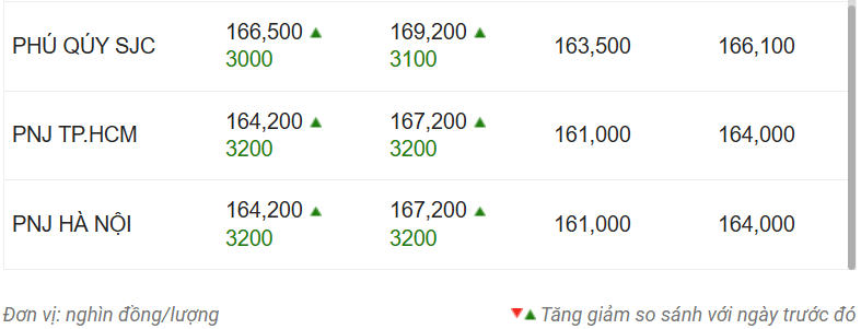Công ty Vàng bạc đá quý Sài Gòn (SJC), Tập đoàn Vàng bạc Đá quý DOJI và Bảo Tín Minh Châu cùng niêm yết giá vàng miếng SJC mua vào-bán ra ở mức 167,2-169,2 triệu đồng/lượng, tăng 3,1 triệu đồng ở cả chiều mua và chiều bán ra so với chốt phiên trước.