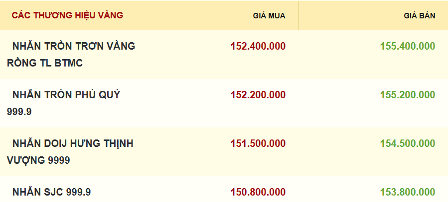 Trong khi đó, giá vàng nhẫn và vàng trang sức 99,99 được các thương hiệu điều chỉnh theo xu hướng tăng 300.000 - 600.000 đồng ở cả hai chiều mua và bán so với phiên trước. Trong đó, giá mua-bán vàng nhẫn tròn trơn vàng rồng Bảo Tín Minh Châu hiện ở mức 152,4-155,4 triệu đồng/lượng. Với các thương hiệu còn lại, giá bán ra vàng nhẫn trong khoảng 153,8-155,2 triệu đồng/lượng.