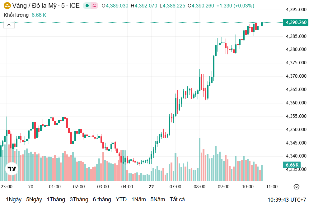Thời điểm 10h40' theo giờ Việt Nam, giá vàng thế giới giao ngay ở mức 4.390 USD/ounce, tăng 35 USD/ounce so với với đầu phiên sáng. Hiện, giá vàng thế giới quy đổi theo tỷ giá niêm yết tại Vietcombank vào khoảng 140 triệu đồng/lượng.