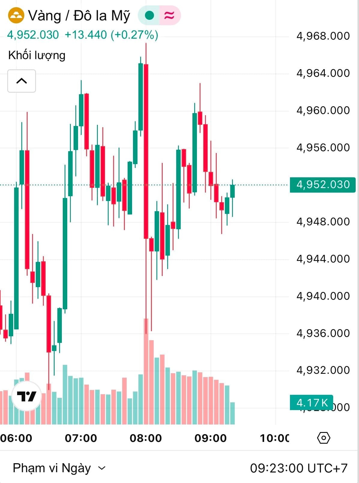 Thời điểm 9h20 theo giờ Việt Nam, giá vàng thế giới giao ngay ở mức 4.952 USD/ounce, bật tăng 2,50% trong 24 giờ qua, tương ứng với tăng 121,05 USD/ounce. Hiện, giá vàng thế giới quy đổi theo tỷ giá niêm yết tại Vietcombank vào khoảng 157,6 triệu đồng/lượng.
