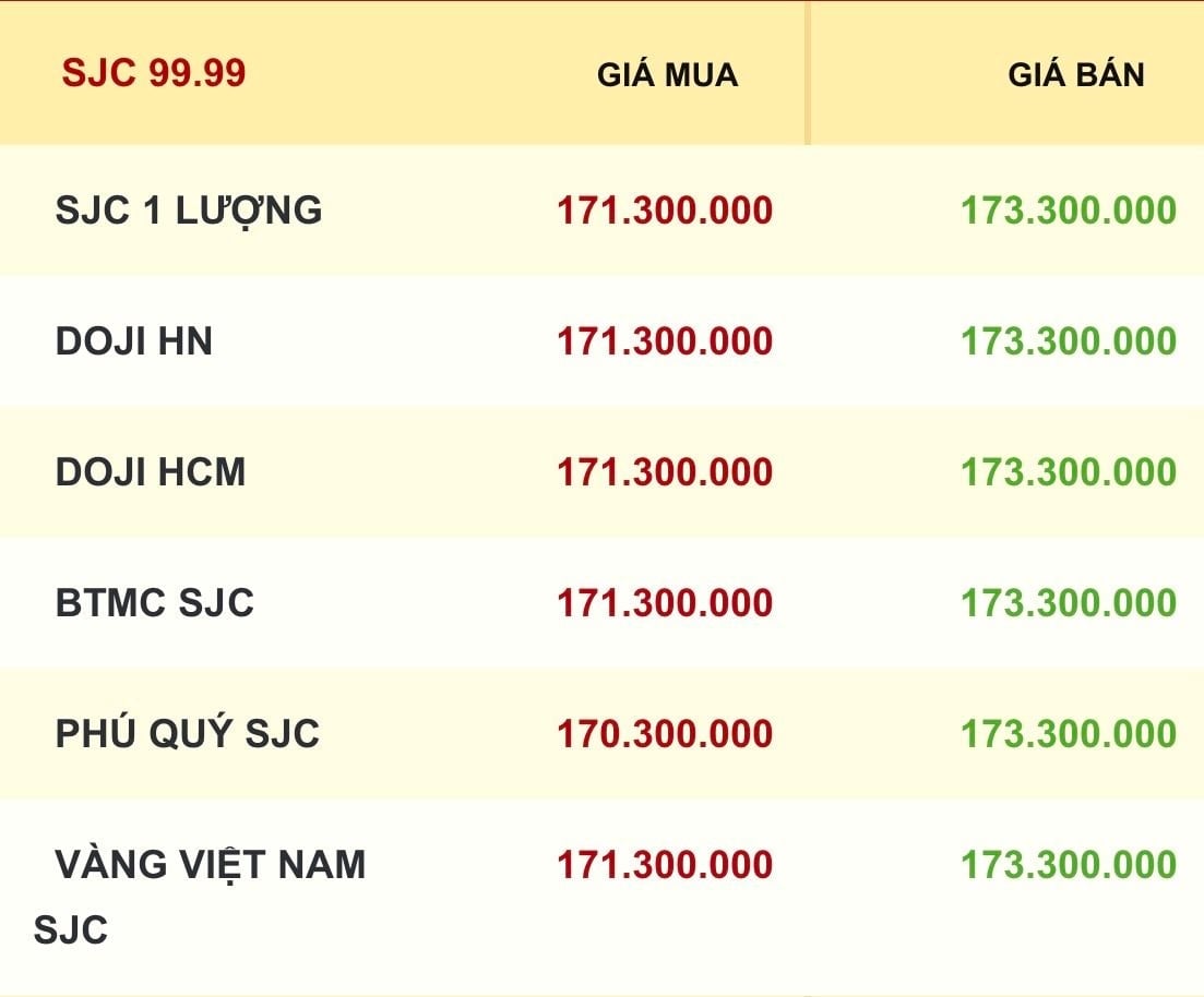 margin: 15px auto;" />Công ty Vàng bạc đá quý Sài Gòn (SJC), Tập đoàn Vàng bạc Đá quý DOJI và Bảo Tín Minh Châu cùng niêm yết giá vàng miếng SJC mua vào-bán ra ở mức 171,3-173,3 triệu đồng/lượng, tăng 4 triệu đồng ở cả chiều mua và chiều bán ra so với chốt phiên trước.