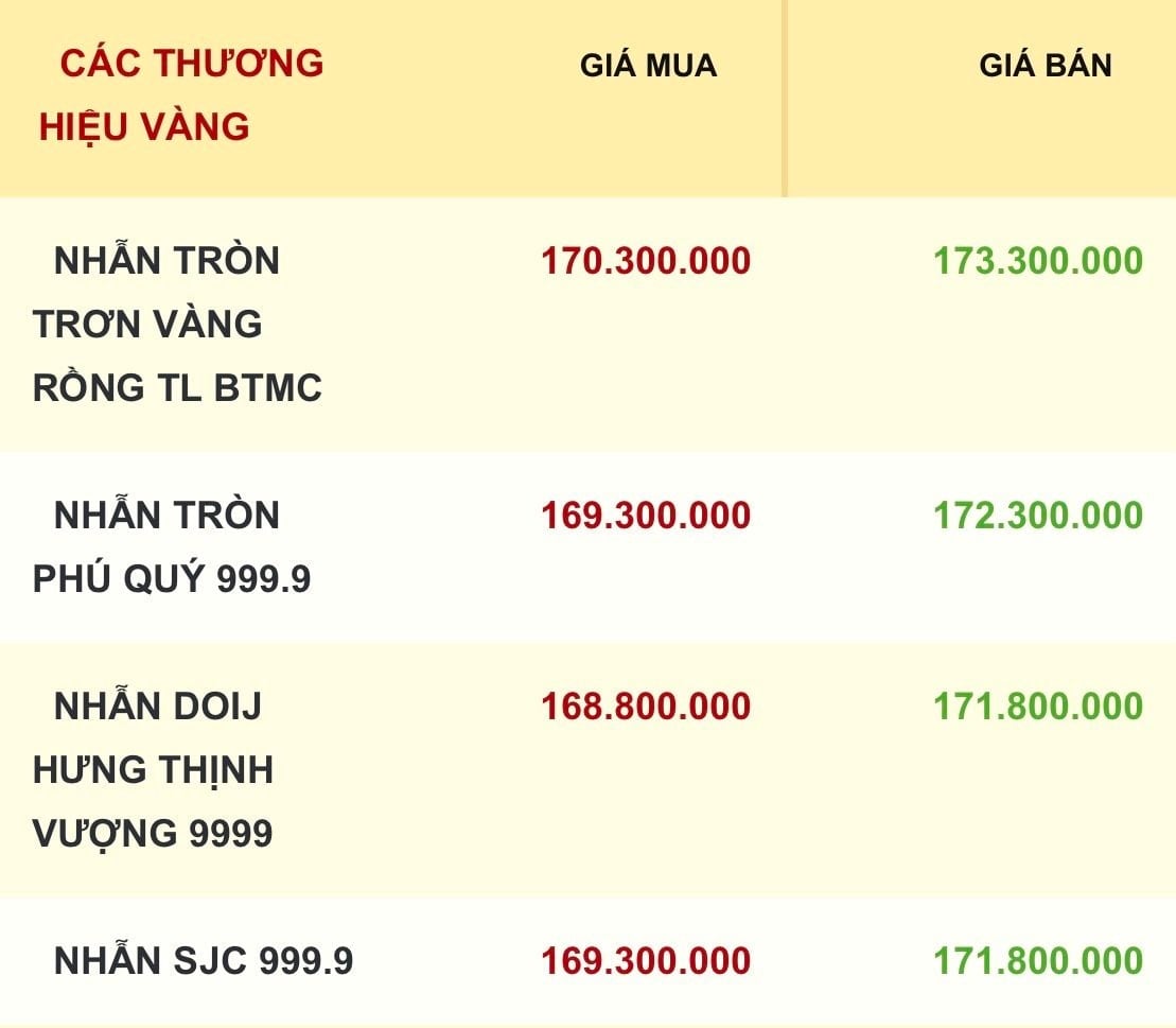 Cùng xu hướng, giá vàng nhẫn và vàng trang sức cũng được các thương hiệu điều chỉnh giảm tăng hơn 4 triệu đồng ở cả 2 chiều mua và bán so với phiên trước. Trong đó, giá mua-bán vàng nhẫn tròn trơn vàng rồng Bảo Tín Minh Châu ở mức cao nhất 170,3-173,3 triệu đồng/lượng. Các thương hiệu còn lại niêm yết giá bán ra vàng nhẫn trong khoảng 171,8-172,3 triệu đồng/lượng.