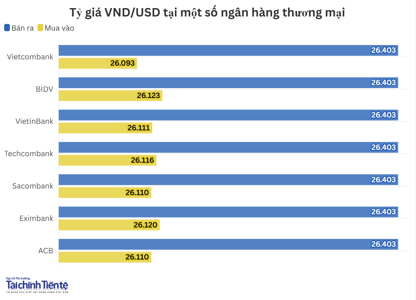 Hiện, giá mua thấp nhất ở mức 26.093 VND/USD, giá mua cao nhất ở mức 26.123 VND/USD. Giá bán ra được các ngân hàng đồng loạt niêm yết ở mức 26.403 VND/USD.