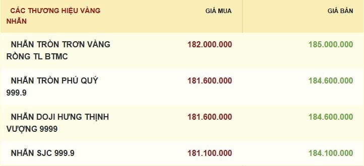 Cùng xu hướng, giá vàng nhẫn và vàng trang sức cũng đi ngang ở cả 2 chiều mua và bán so với phiên sáng ngày hôm trước. Trong đó, giá mua-bán vàng nhẫn tròn trơn vàng rồng Bảo Tín Minh Châu ở mức cao nhất 182-185 triệu đồng/lượng. Các thương hiệu còn lại niêm yết giá vàng nhẫn mua vào - bán ra trong khoảng 181,1 - 184,6 triệu đồng/lượng.