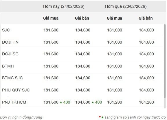 margin: 15px auto;" />Công ty Vàng bạc đá quý Sài Gòn (SJC), Tập đoàn Vàng bạc Đá quý DOJI, Bảo Tín Minh Châu, Bảo Tín Mạnh Hải và Phú Quý SJC cùng niêm yết giá vàng miếng SJC mua vào-bán ra ở mức 181,6-184,6 triệu đồng/lượng, đi ngang ở cả chiều mua và chiều bán ra so với phiên sáng ngày 23/2.