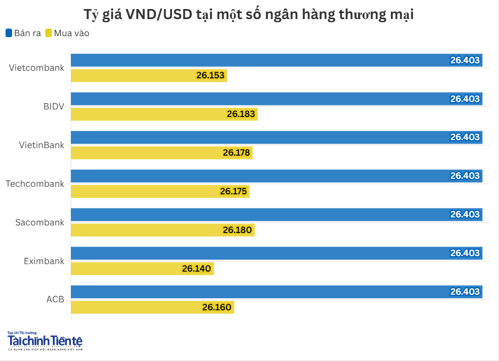 Hiện, giá mua thấp nhất ở mức 26.140 VND/USD, giá mua cao nhất ở mức 26.183 VND/USD. Giá bán ra được các ngân hàng đồng loạt niêm yết ở mức 26.403 VND/USD.