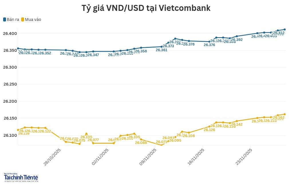 Cụ thể, lúc 10h hôm nay, tại Vietcombank, giá mua - bán đồng USD được niêm yết ở mức 26.153 - 26.403 VND/USD, tăng 2 đồng ở cả chiều mua và bán so với chốt phiên ngày 24/11.