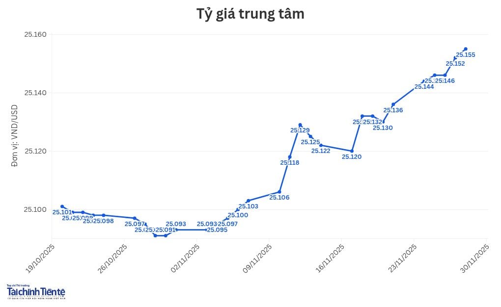 (Banker.vn) Sáng ngày 25/11, tỷ giá trung tâm giữa đồng Việt Nam (VND) với đồng đô la Mỹ (USD) được Ngân hàng Nhà nước (NHNN) công bố ở mức 25.146 đồng, tăng 2 đồng so với chốt phiên ngày 24/11.