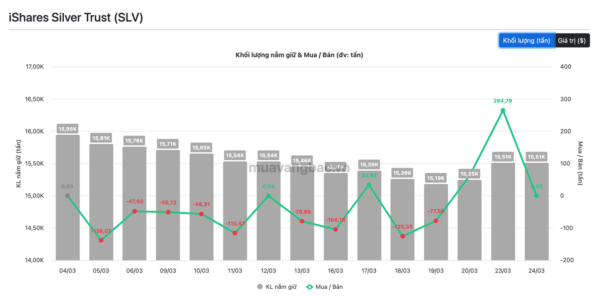 Dữ liệu muavangbac.vn cho thấy, trong phiên giao dịch ngày 24/3, quỹ bạc lớn nhất thế giới iShares Silver Trust (SLV) do BlackRock quản lý tiếp tục mua ròng sau khi đã mua gần 265 tấn bạc, tuy nhiên số lượng mua chỉ 0,03 tấn. Tính đến thời điểm hiện tại, SLV còn nắm khoảng 15.510 tấn bạc, tương ứng hơn gần 35 tỷ USD.