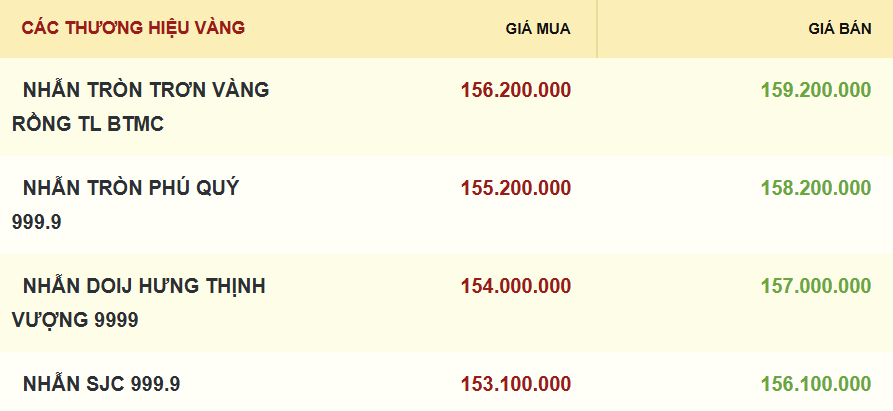 Trong khi đó, giá vàng nhẫn và vàng trang sức 99,99 được các thương hiệu điều chỉnh theo xu hướng tăng 700.000 - 900.000 đồng/lượng ở cả hai chiều mua và bán so với phiên trước. Trong đó, giá mua-bán vàng nhẫn tròn trơn vàng rồng Bảo Tín Minh Châu hiện ở mức 156,2-159,2 triệu đồng/lượng. Với các thương hiệu còn lại, giá bán ra vàng nhẫn trong khoảng 156,1-158,2 triệu đồng/lượng.