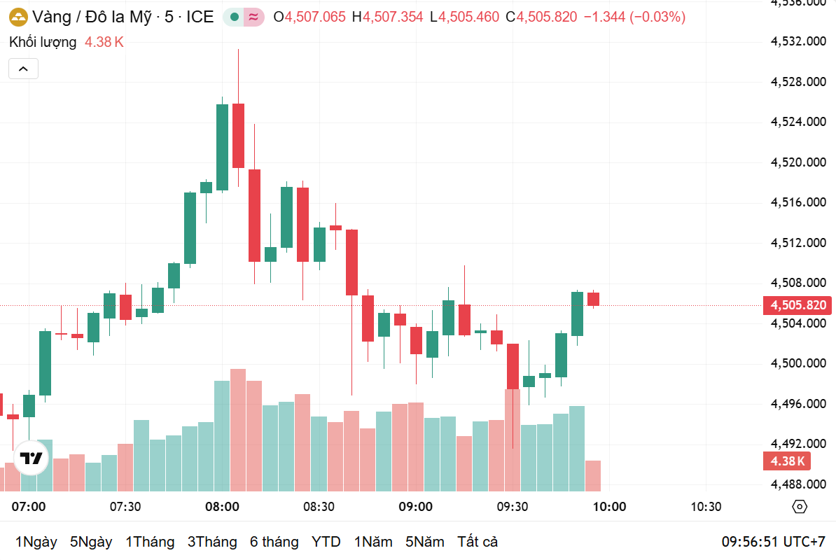 Thời điểm 10h00' theo giờ Việt Nam, giá vàng thế giới giao ngay ở mức 4.505 USD/ounce, tăng 26,76 USD/ounce so với với đầu phiên sáng. Hiện, giá vàng thế giới quy đổi theo tỷ giá niêm yết tại Vietcombank vào khoảng 143,3 triệu đồng/lượng.