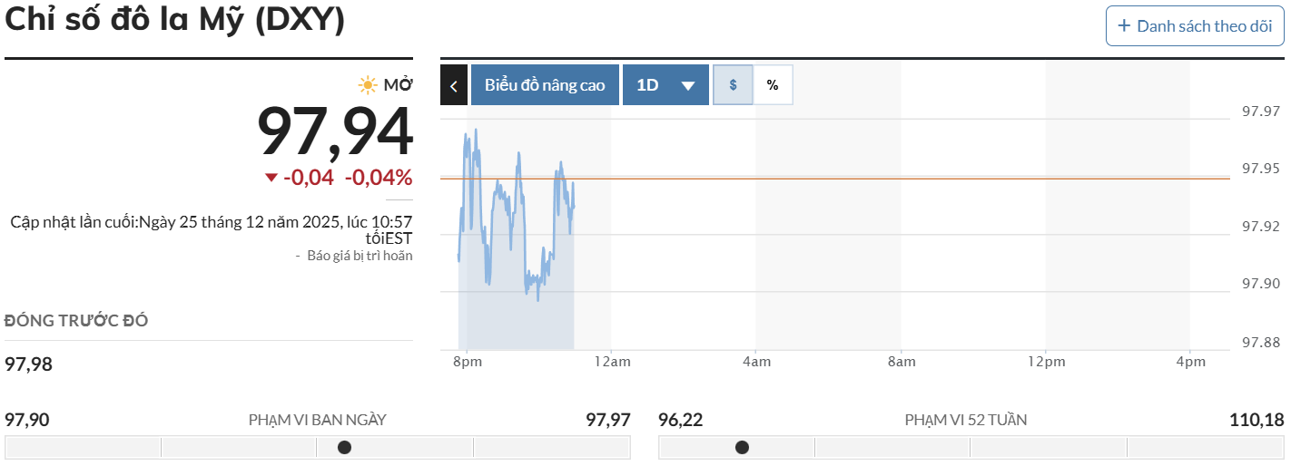 Cùng thời điểm, trên thị trường thế giới, chỉ số USD Index (DXY) - thước đo sức mạnh của đồng bạc xanh so với 6 đồng tiền chủ chốt - giảm 0,04%, hiện ở mức 97,94 điểm so với phiên trước.