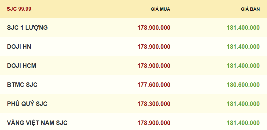 margin: 15px auto;" />Công ty Vàng bạc đá quý Sài Gòn (SJC), Tập đoàn Vàng bạc Đá quý DOJI cùng niêm yết giá vàng miếng SJC mua vào-bán ra ở mức 178,9-181,4 triệu đồng/lượng, tăng 4,1 triệu đồng ở cả chiều mua và chiều bán ra so với chốt phiên hôm qua.